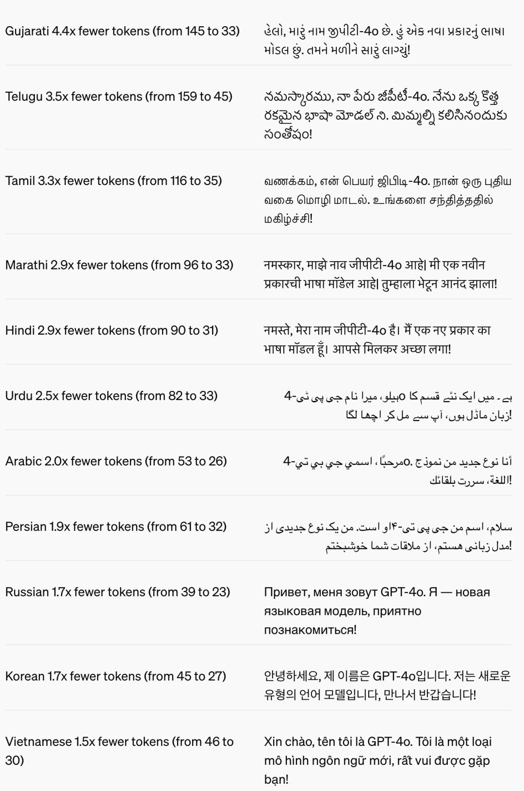 GPT-4o还有超高的“语言天赋”,能支持50种语言,并显着提高了非英语语言的性能,包括改进分词器以更好地压缩其中的许多语言: