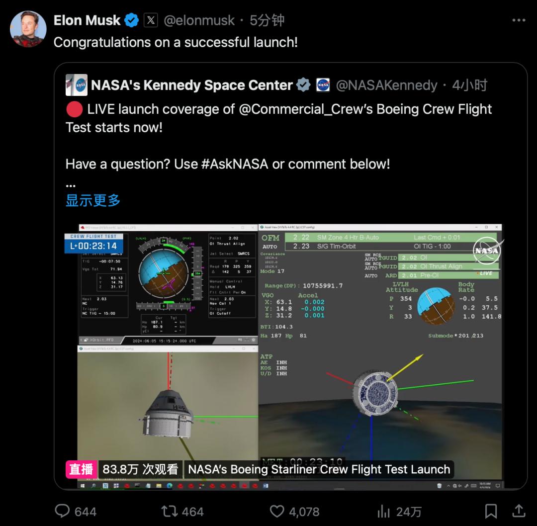直播飞行过程中,马斯克也实时在线观看,还第一时间送上了祝福。