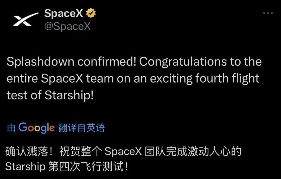 最终,星舰本体实现可控再入,成功在印度洋溅落,完成既定目标,第四次飞行测试圆满成功。
