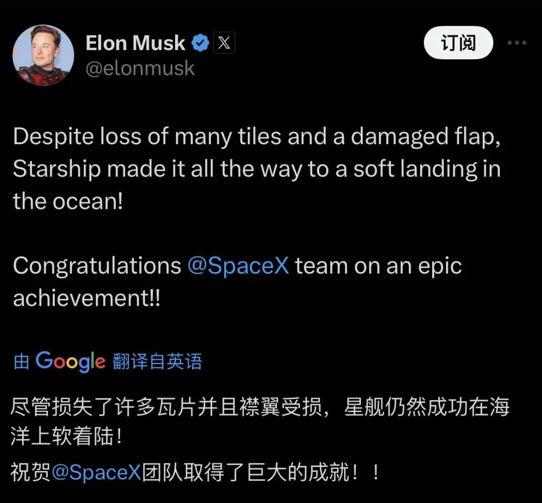 马斯克也在第一时间公布了最新消息:“尽管损失了许多瓦片并且襟翼受损,星舰仍然成功在海洋上软着陆!祝贺@SpaceX团队取得了巨大的成就!!”