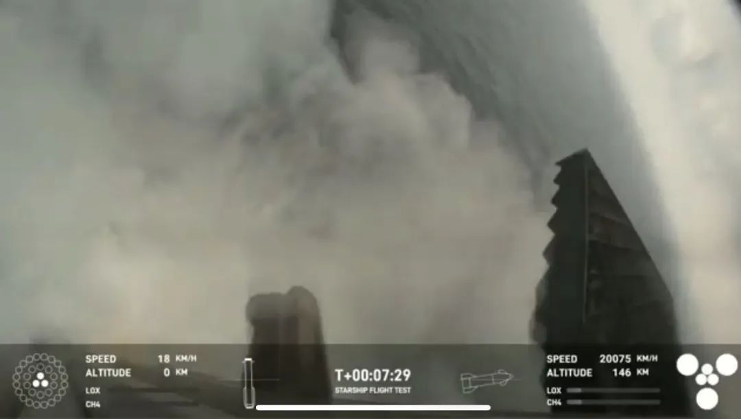 试飞过程中,星舰发射升空成功,猛禽发动机在热级分离过程中点火。