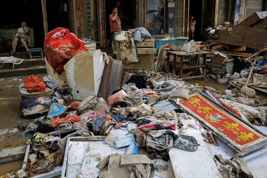 7月3日,中国湖南省岳阳市平江县发生洪水后,居民在一堆洪水冲击后的碎片旁观看。路透社/王菁树 Residents look on near a pile of debris after a flood following heavy rainfall in Pingjiang county of Yueyang, Hunan province, China July 3, 2024. REUTERS/Tingshu Wang