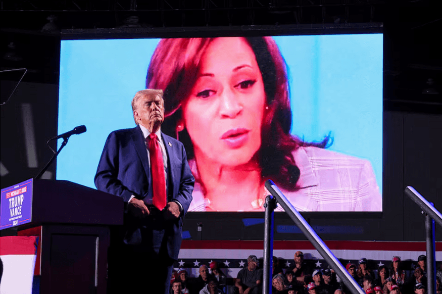 2024 年 10 月 18 日,美国密歇根州底特律市亨廷顿广场举行的一次集会上,共和党总统候选人、前美国总统唐纳德·特朗普在场,民主党总统候选人、美国副总统卡玛拉·哈里斯的面部出现在屏幕上播放的视频中。