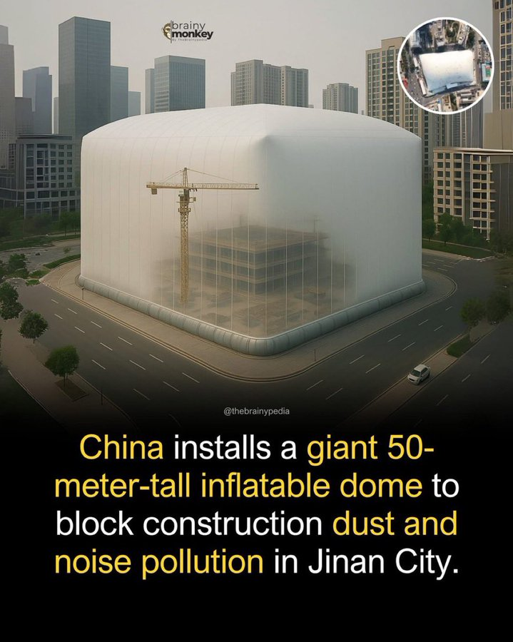 China has installed a massive 50-meter-high inflatable dome over a construction site in Jinan city to reduce dust and noise pollution, making it one of the most innovative environmental solutions in urban development. According to Gulf News, the dome covers an area of about 20,000 square meters and is made from durable, weather-resistant materials. It stays upright through a constant air pressure system, which means it doesn’t need internal supports and can fully enclose the construction site. This helps trap dust particles and significantly reduce the noise from heavy machinery, improving the quality of life for nearby residents.